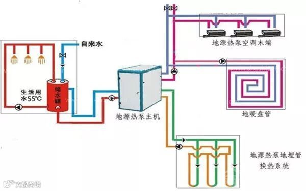 地源热泵可带动水地暖、中央空调,并能提供生活热水,可以替换原来的锅炉加空调的两套装置。地源热泵系统是从常温土壤或地表水,冬季从地下提取热量,夏季把建筑的热量又存入地下,从而解决冬夏两季采暖和空调的冷热源。