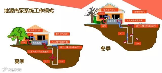 地源热泵是利用水与地能(地下水、土壤或地表水)进行冷热交换来作为水源热泵的冷热源,冬季把地能中的热量“取”出来,供给室内采暖,此时地能为“热源”;夏季把室内热量取出来,释放到地下水、土壤或地表水中,此时地能为“冷源”。