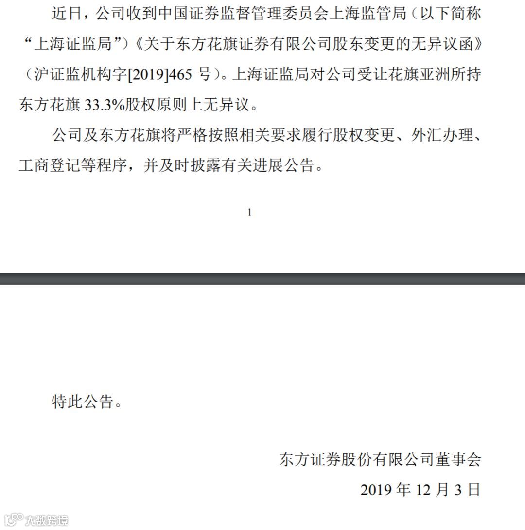 12月3日晚间,东方证券公告,收到上海证监局《关于东方花旗证券有限公司股东变更的无异议函》。上海证监局对公司受让花旗亚洲所持东方花旗33.3%股权原则上无异议。