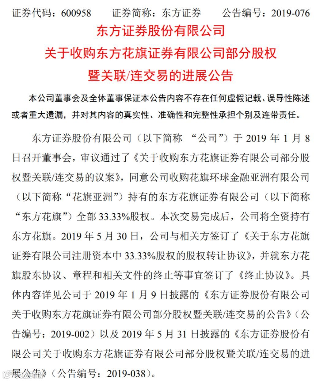 2019年1月8日,东方证券召开董事会,审议通过了《关于收购东方花旗证券有限公司部分股权暨关联/连交易的议案》,同意东方证券收购花旗亚洲持有的东方花旗全部33.33%股权。