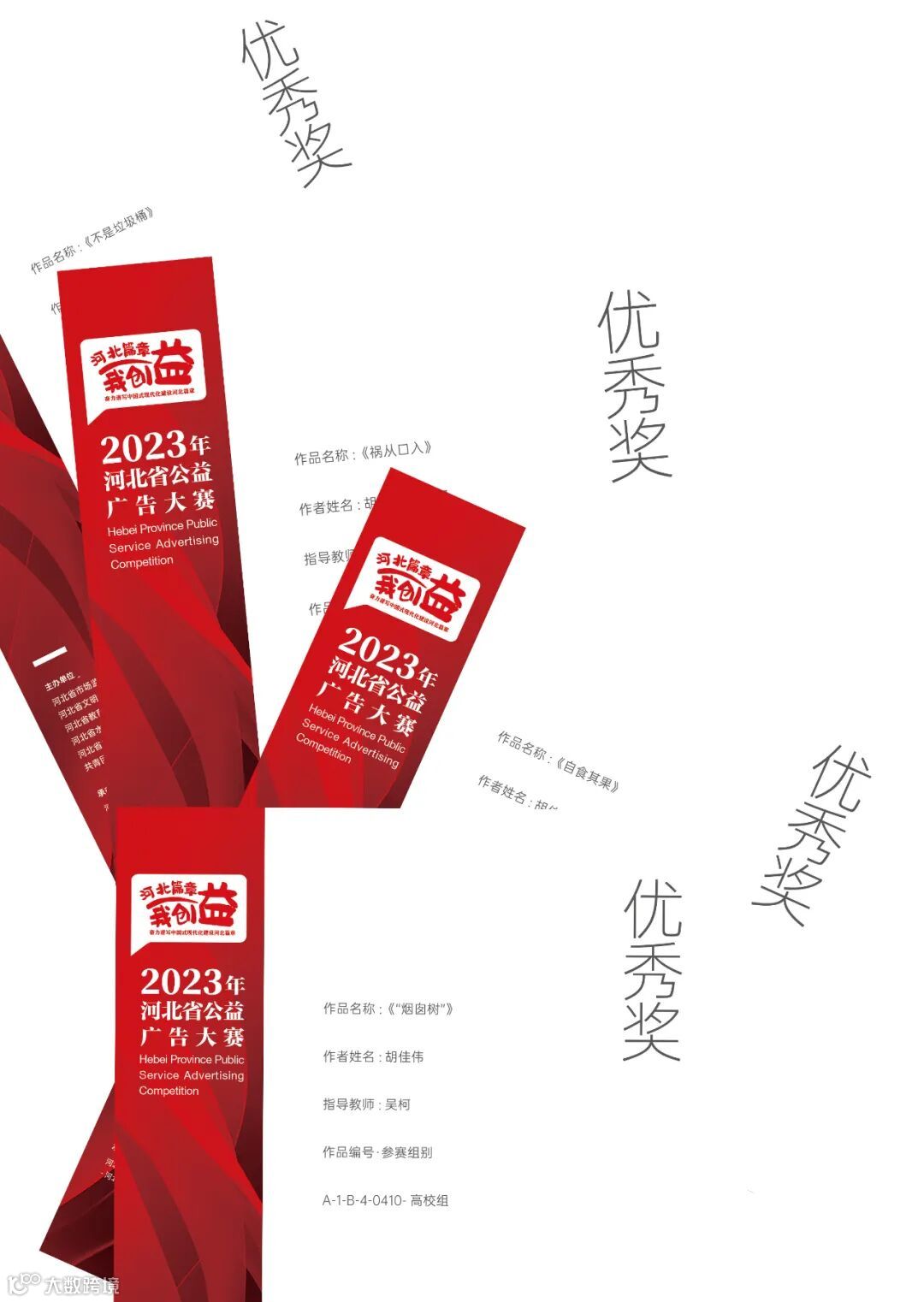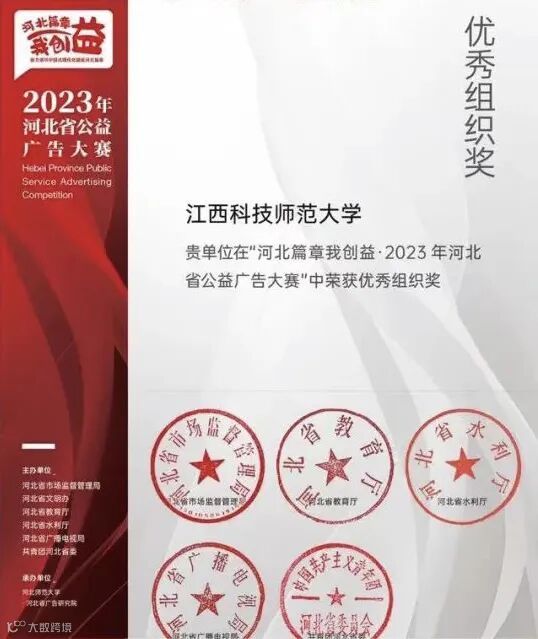 近日,由河北省市场监督管理局发起,联合省教育厅、省文明办、省水利厅、省广播电视局、共青团河北省委等六部门共同举办的2023年河北省公益广告大赛作品评审工作已圆满收官。我校荣获优秀组织奖,21环设3班胡佳伟同学创作作品获得优秀奖。