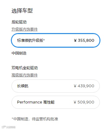 根据特斯拉官网显示,单电机、双电机、三电机三个版本的价格分别为3.99万美元、4.99万美元和6.99万美元。