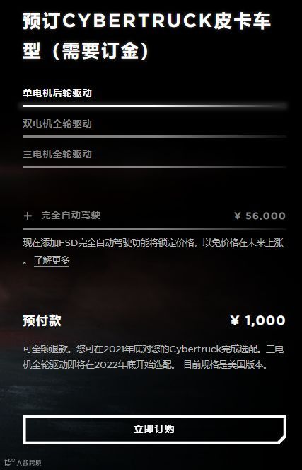 据悉,此次新车的预订金额在100美金,国内官网显示订金为1000元人民币。