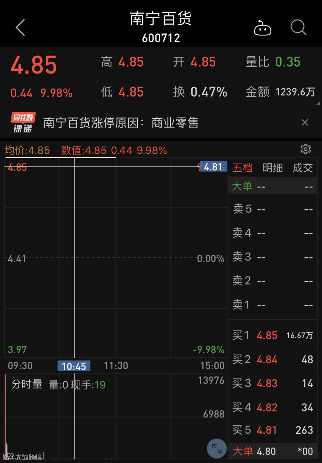 受此消息影响,南宁百货今日开盘直接拉涨停,股价报4.85元,换手率为0.47%,封单16.67万手。