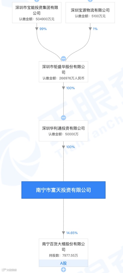 天眼查显示,南宁富天的控股股东为深圳华利通,深圳华利通的控股股东为深圳钜盛华,后者同时持有前海人寿51%的股份。