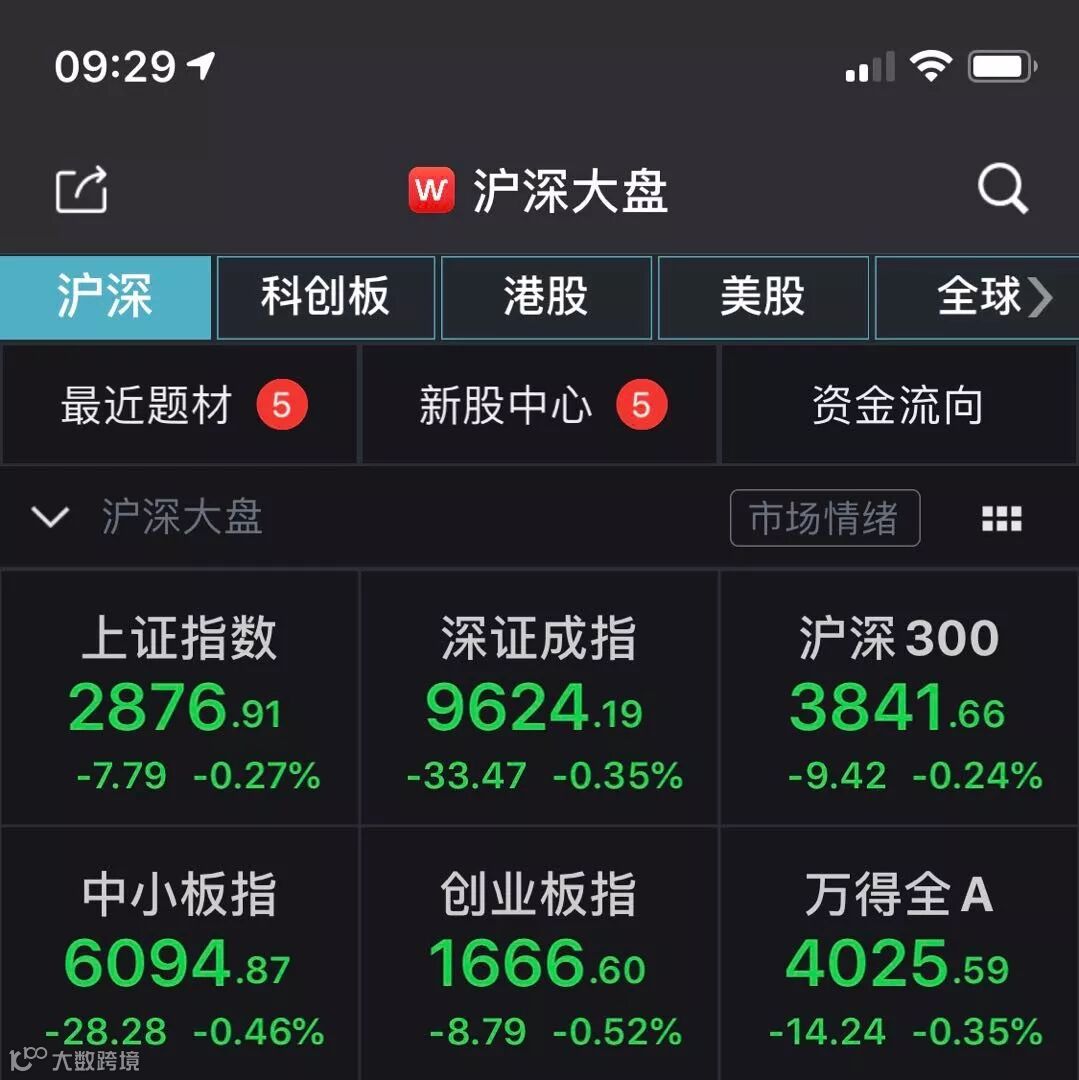 A股方面,今日开盘各主要指数集体低开,沪指跌0.27%,报2896.91点;深证成指跌0.35%,创业板指跌0.52%。黄金、种业等板块涨幅居前。信息安全、消费电子、5G概念、芯片等板块跌幅居前。