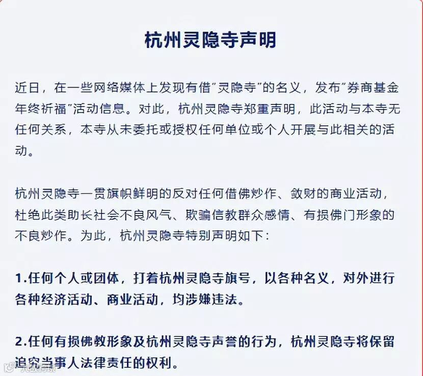 12月15日上午,杭州灵隐寺在其官方微信号发布声明称,近日,在一些网络媒体上发现有借“灵隐寺”的名义,发布“券商基金年终祈福”活动信息。对此,杭州灵隐寺郑重声明:“此活动与本寺无任何关系,本寺从未委托或授权任何单位或个人开展与此相关的活动。”