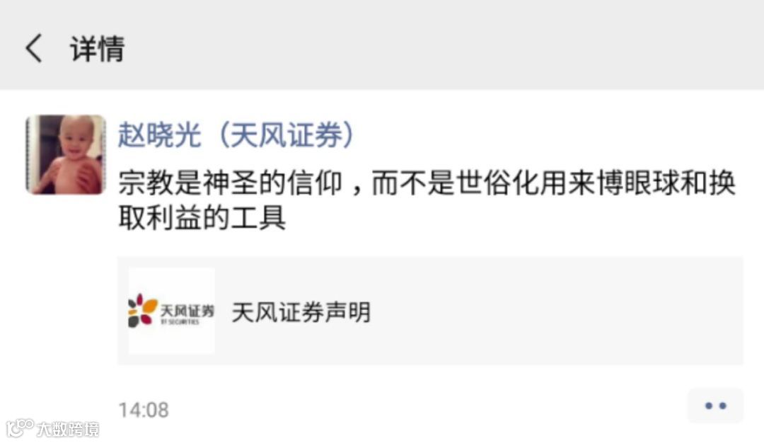 天风证券副总裁、研究所所长赵晓光今天下午也在朋友圈发布消息表示:“宗教不是世俗化用来博眼球和换取利益的工具。”