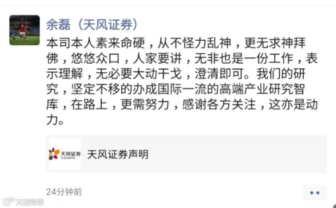 天风证券董事长余磊今日发布朋友圈表示:“本司本人从不怪力乱神,更无求神拜佛。我们的研究,坚定不移的办成国际一流的高端产业研究智库。”
