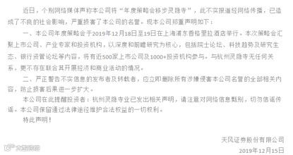 15日下午,天风证券也在其官方微信号上发布声明称,近日,个别网络媒体声称公司将“年度策略会移步灵隐寺”,此为不实报道经网络传播,已造成了不良的社会影响,严重损害了公司的名誉。