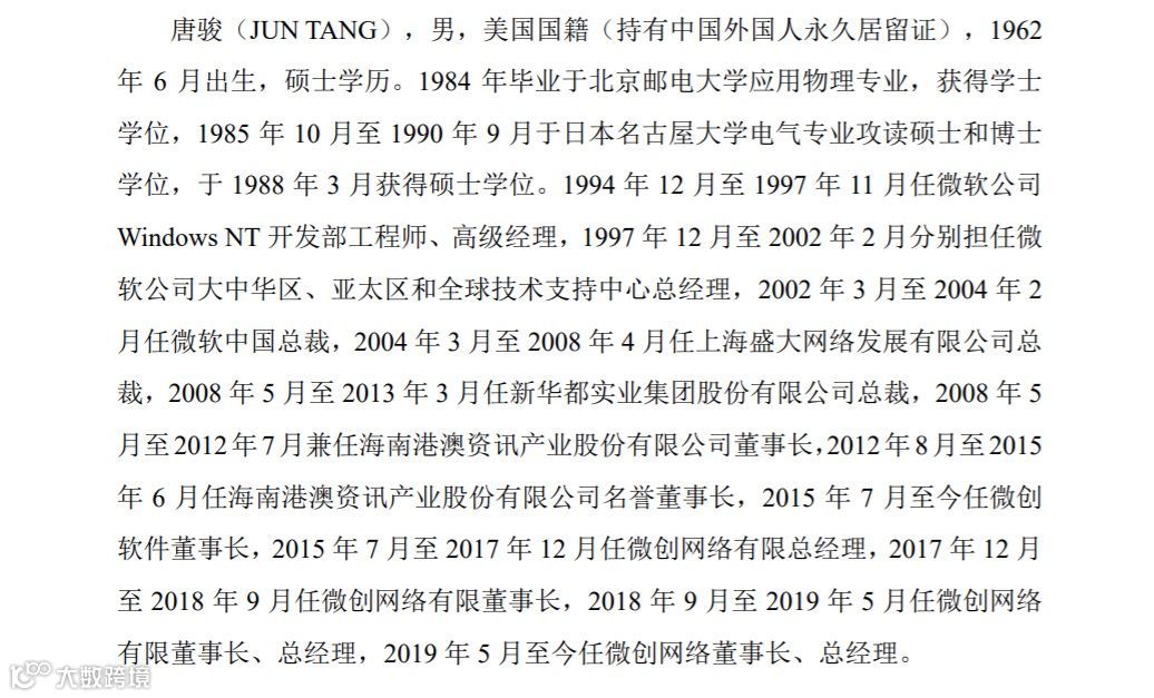 招股书显示唐骏硕士学历、美国国籍
