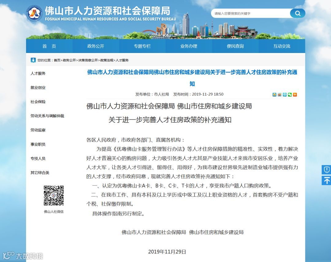 11月29日,佛山市人力资源和社会保障局在官网发布《关于进一步完善人才住房政策的补充通知》,在佛山市工作、具有本科及以上学历或中级工及以上职业资格的人才,首套购房不受户籍和个税、社保缴存限制。