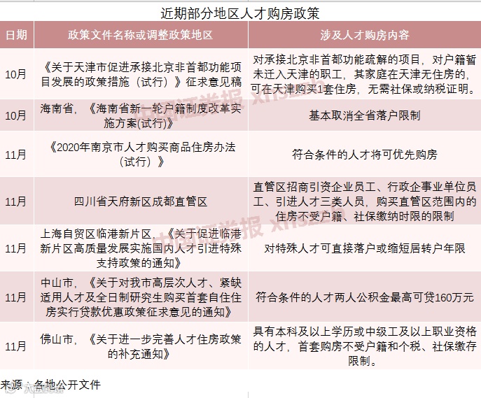 10月全国有超过23城发布人才购房政策,11月有超过20城发布了各种类型的人才吸引政策,南京、上海、成都、中山等接近10个城市发布的人才政策有人才购房资格、购房补贴相关的内容。其中最典型的包括天津、南京六合、三亚等。