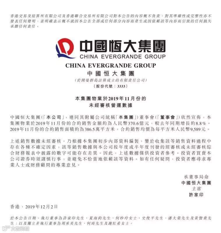 12月2日,中国恒大(HK.3333)发布11月销售简报,当月实现合约销售额370.6亿元。截至11月末,累计实现销售额5805.4亿元,目标完成率97%,完成全年6000亿目标毫无悬念。