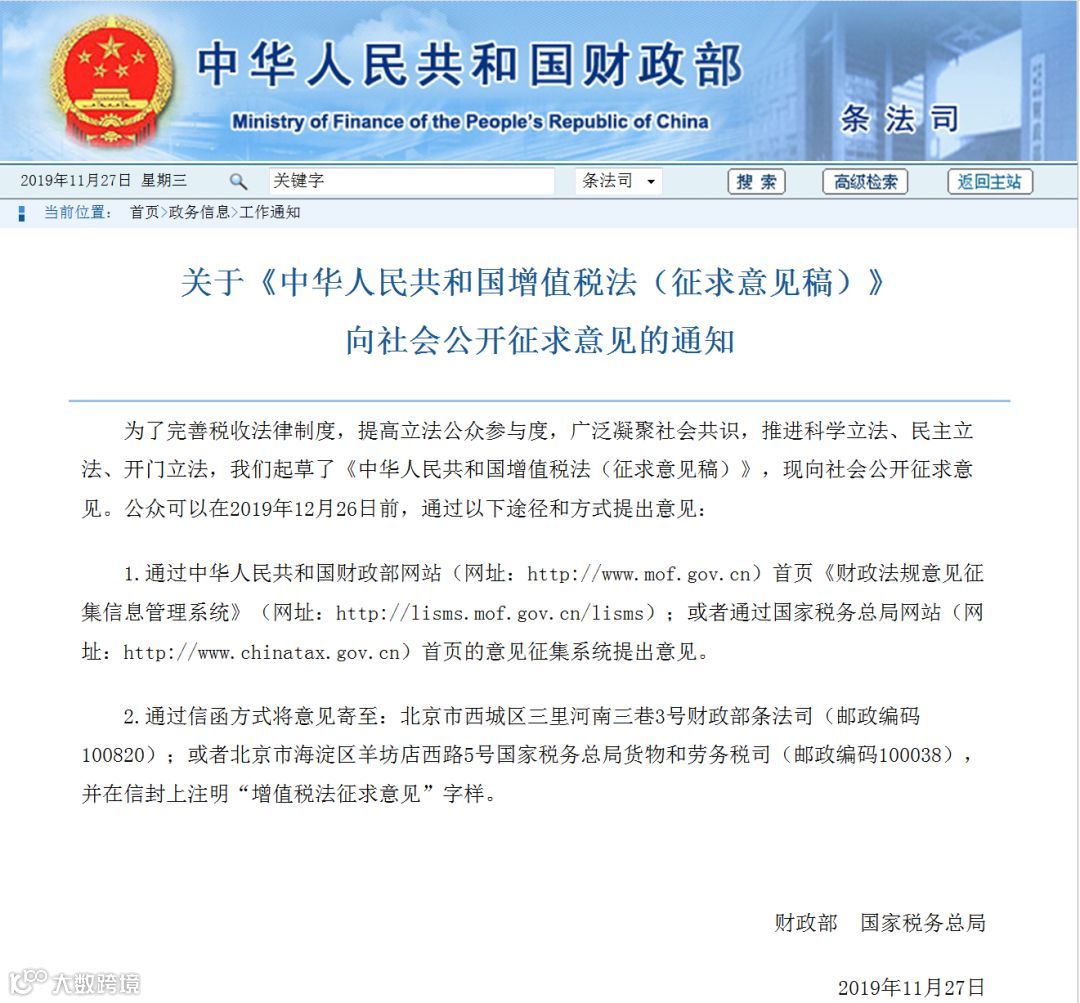财政部网站发布消息,财政部、国家税务总局起草了《中华人民共和国增值税法(征求意见稿)》(以下简称《征求意见稿》),现向社会公开征求意见。