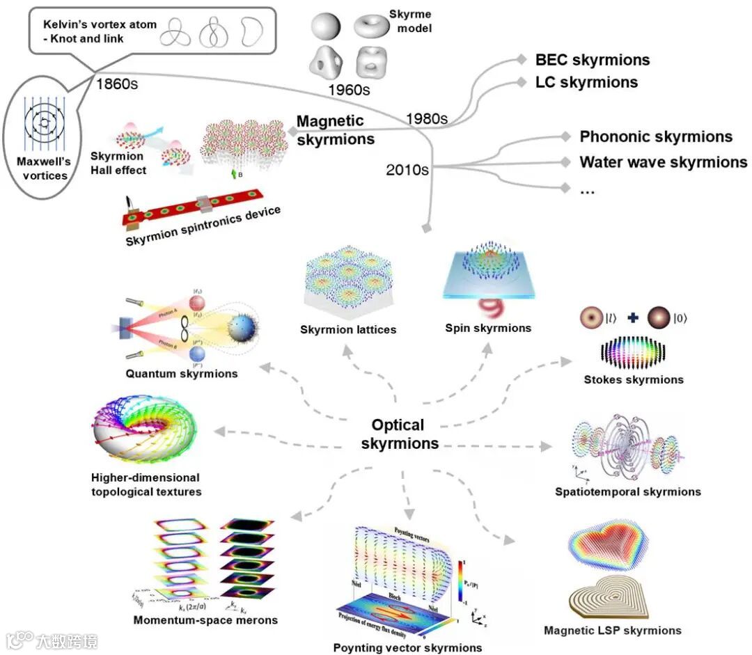 这篇综述性教程论文首先从 Kelvin 的涡旋原子设想与 Skyrme 的非线性场论出发,系统梳理了斯格明子概念在物理学中的历史演进脉络,勾勒出拓扑思想在不同物理体系中逐步深化与拓展的发展轨迹。