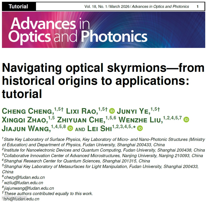 近日,复旦大学光子晶体课题组在国际光学领域顶级期刊《Advances in Optics and Photonics》(AOP)上发表题为《Navigating optical skyrmions—from historical origins to applications: tutorial》的综述性教程论文。该论文系统性梳理了光学斯格明子的研究历史、数学结构、产生、传播、操控和应用等。论文的共同第一作者为复旦大学博士生程澄、饶立希和叶俊燚,通讯作者为复旦大学的车治辕博士(现为同济大学助理教授)、刘文哲助理教授、王佳俊助理教授和石磊教授。