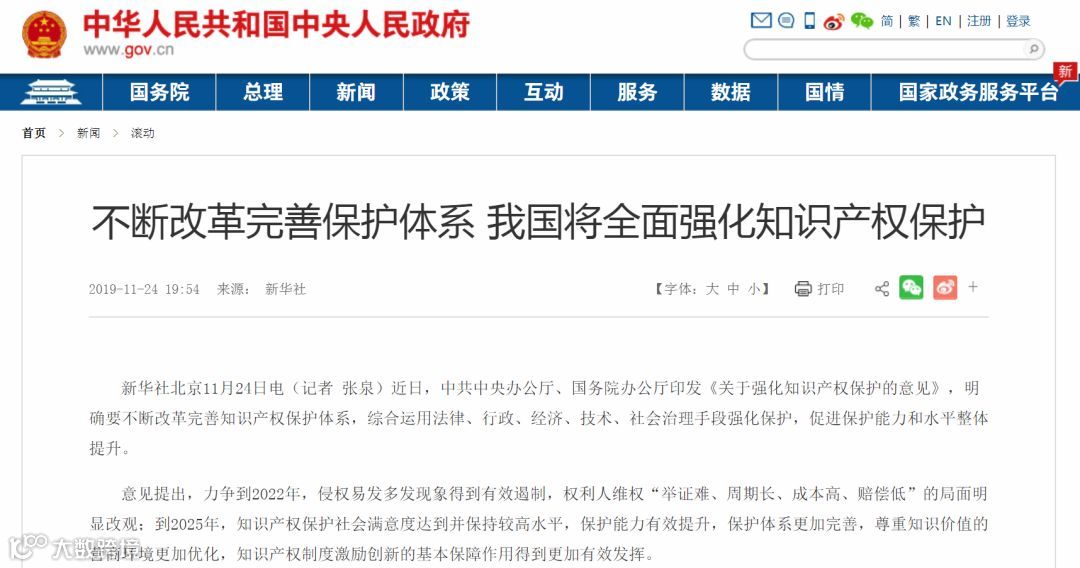 中共中央办公厅、国务院办公厅印发《关于强化知识产权保护的意见》(以下简称“《意见》”),要求各地区各部门结合实际认真贯彻落实。