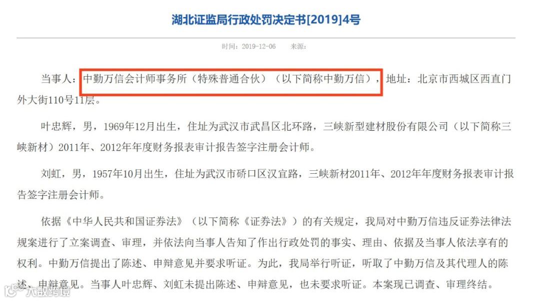 12月6日,湖北证监局网站披露的行政处罚决定书显示,中勤万信会计师事务所(特殊普通合伙)(简称“中勤万信”)被湖北证监局没收审计业务收入95万元,并处以95万元的罚款;对签字注册会计师叶忠辉、刘虹给予警告,并分别处以5万元的罚款,累计处罚200万元。