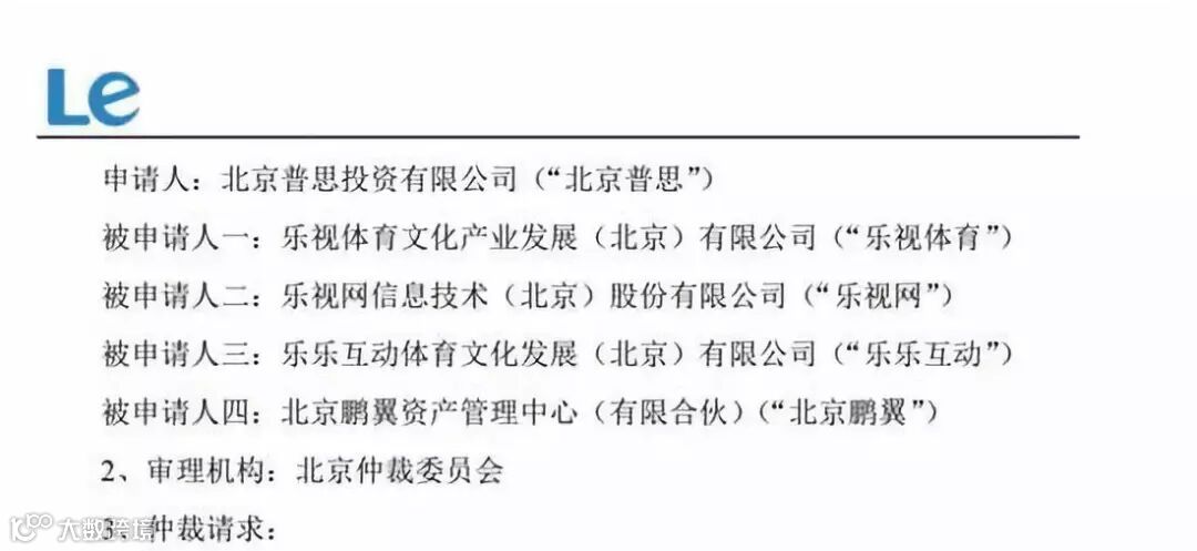 北京普思要求裁决乐视体育赔偿经济损失9785.16万元;裁决乐视网、乐乐互动、北京鹏翼对乐视体育在第一项仲裁请求中所负给付义务承担连带责任。
