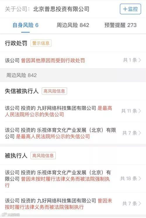 普思资本所投的两家公司九好网络科技集团有限公司、乐视体育文化产业发展(北京)有限公司均为最高人民法院所公示的失信公司。
