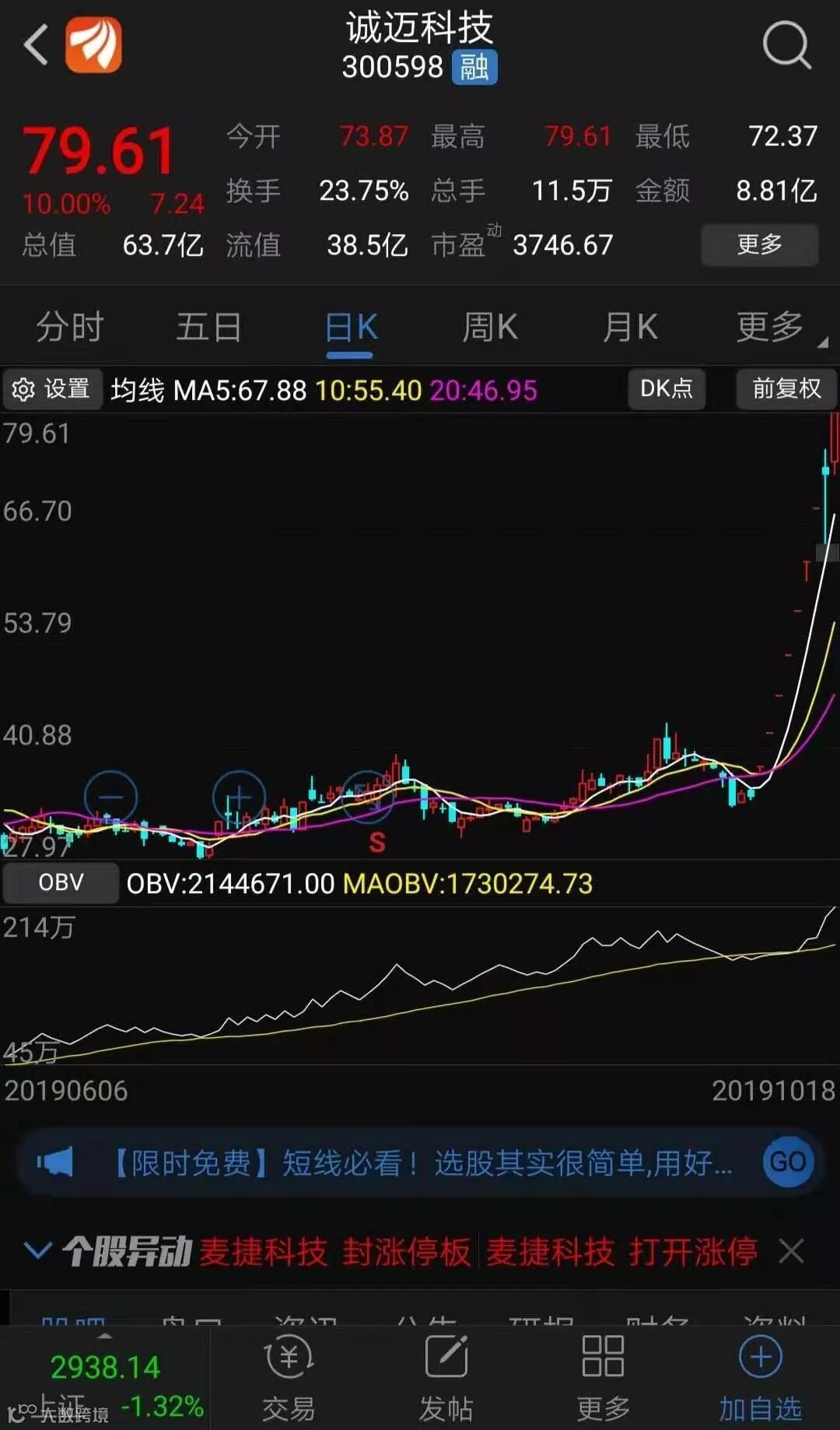 该投资事项引发市场对公司将与360公司合作开发操作系统的猜测。诚迈科技在二级市场亦备受追捧。东方财富Choice数据显示,诚迈科技10月8日至16日连续7个交易日涨停。10月17日早盘一度涨停,最终收报72.37元,上涨5.63%,当天成交额15.67亿元。