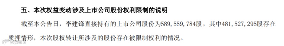 值得注意的是,李建锋转让股权的背后,是高比例的股权质押。截至目前,李建锋直接持有中核钛白股份5.90亿股,其中4.82亿股存在质押情形。本次股权转让所涉及的股份存在被限制权利的情况。