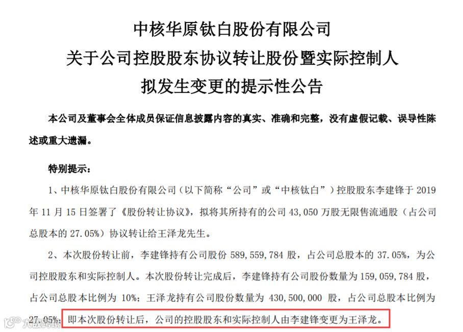 中核钛白11月15日晚公告,控股股东李建锋拟将其所持公司27.05%的股份协议转让给王泽龙,转让价格3.8元/股,合计金额16.36亿元。转让完成后,王泽龙将成为公司控股股东和实际控制人