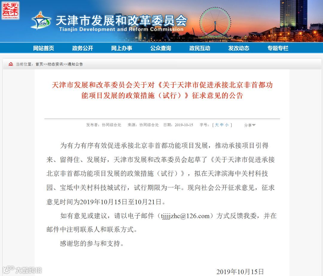 天津市发改委官网披露,为有力有序有效促进承接北京非首都功能项目发展,推动承接项目引得来、留得住、发展好,天津市发改委起草了《关于天津市促进承接北京非首都功能项目发展的政策措施(试行)》(简称《政策》)。