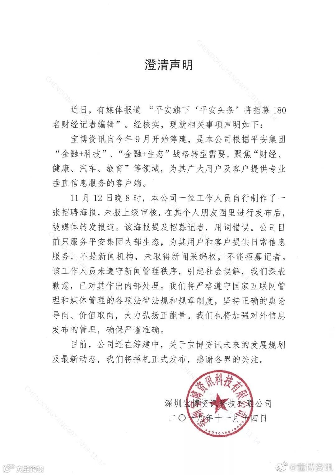 11月14日,这则招聘信息的主体“平安头条”运营方宝博资讯正式发布了一则澄清声明。