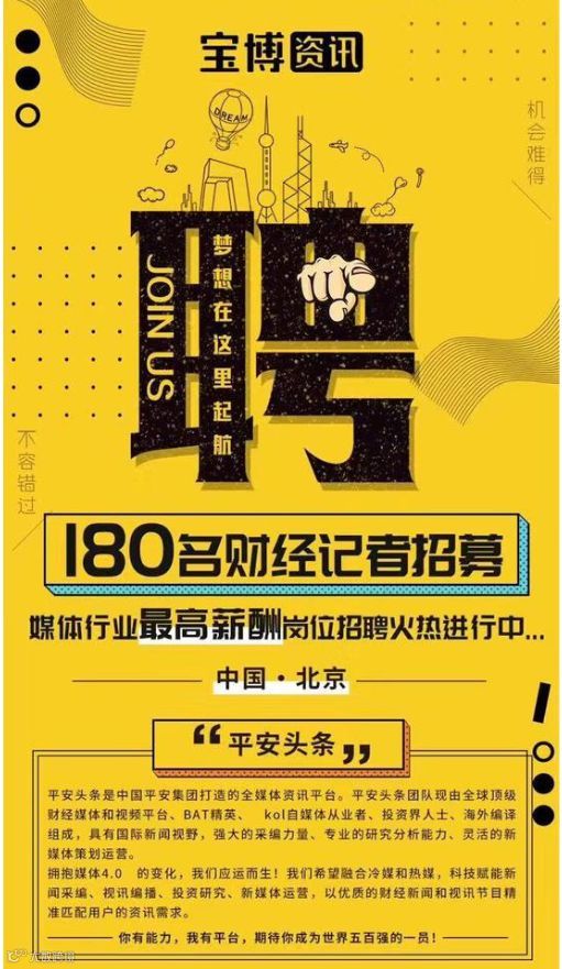 上述海报提及的“平安头条”运营主体宝博资讯今日发布声明称,公司未取得新闻采编权,不能招募记者。