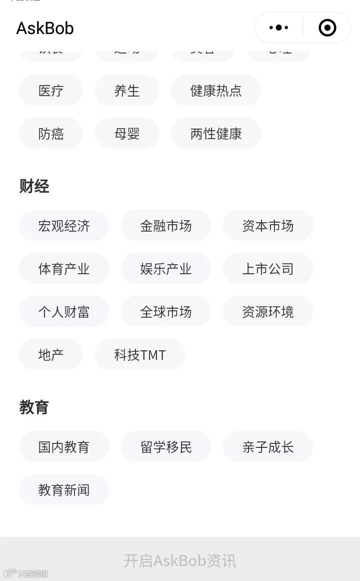 目前外界对于 “平安头条”的具体模样还不甚了解,但中证君发现,在微信上搜索“宝博资讯”,已经有同名的小程序在运营。该小程序英文名为AskBob,内容涉及财经、汽车、健康、教育等板块,开发者为深圳平安通信科技有限公司,更新时间显示为近一周。