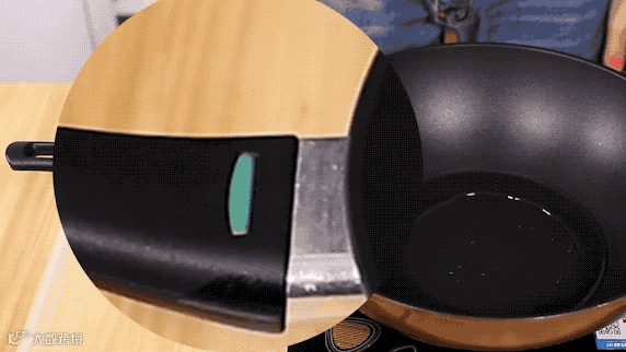 这款锅还可以智能控温,当油温到140℃~150℃时,手柄处的感温器就会变成绿色。