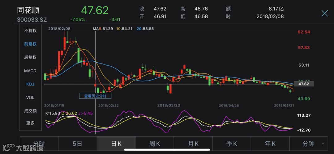 相同的剧情在2018年2月7日晚间同花顺披露新的减持计划后再次上演,公司股价在随后的两个交易日里分别大跌7.05%和6.53%,随后紧接着便是一波反弹。