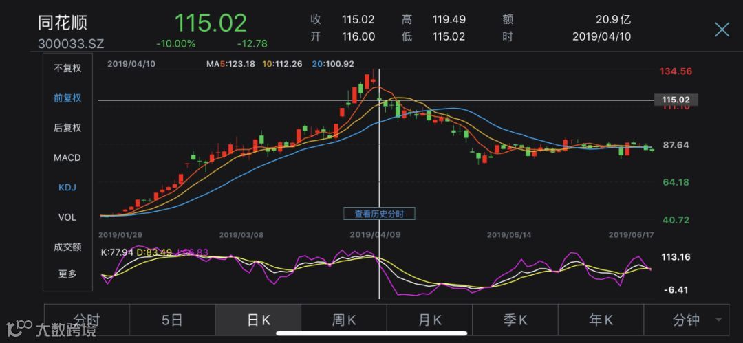不过,在2019年4月9日晚间同花顺披露新的股东减持计划后,公司股价则在4月10日直接跌停,并带来一波连续的下跌。当然,这与同花顺股价刚刚创出历史新高,而股东便宣布高位减持有很大关系。