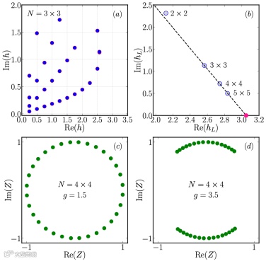 图2. 二维伊辛模型量子相变的李-杨理论 (a) 保真度零点(b) 保真度零点的标度行为(c)-(d) 保真度零点的李-杨单位圆定理。