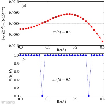 图1. 非厄米对称性破缺 (a) 偶宇称和奇宇称的基态能级实部之差(b) 保真度零点