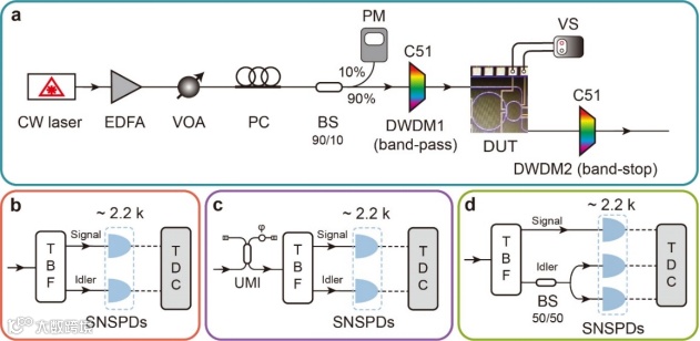 制作的PT对称性耦合双环器件被用于产生关联光子对,其实验装置如图3所示。图3a-3d分别绘制了关联光子对的产生、符合计数测试、基于Franson型干涉仪的能量-时间纠缠测试以及宣布式单光子产生测试的装置图。