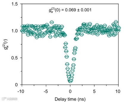 最后,基于自发非线性效应产生的光子对可用于宣布式单光子的产生。通过信号光子宣布闲频光子的到达,测试了闲频光子的二阶自关联(三重符合计数实验),研究团队得出闲频光子零延时处二阶自关联值为0.069 ± 0.001,表明光源具有良好的单光子性,如图6所示。