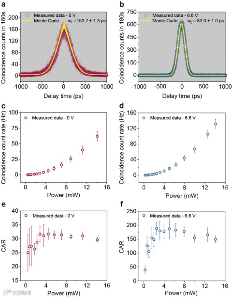符合计数图样4a和4b显示,从0 V 到6.6 V的电压变化下,计数图样的总不确定度有明显的下降。由于光子寿命在6.6 V偏置下较短,同时测试系统具有几十皮秒量级的时间抖动,研究团队利用混合拉普拉斯(光子寿命)-高斯(时间抖动)分布来拟合符合计数图样。通过1000次蒙特卡洛(Monte Carlo)模拟,最终提取出0 V、6.6 V情况下的光子寿命以及不确定度,分别为129.6 ± 1.9 ps和7.1 ± 1.5 ps,实现近20倍的寿命调控范围(系统时间抖动为82.8 ± 0.9 ps)。该结果与光谱测试中得到的Q值变化情况相当,验证了自发四波混频过程产生的光子对的时频关系。之后,测试了光子对产生速率以及光源的符合-偶然符合计数比(CAR)随泵浦功率的变化图,如图4c-4f所示。值得注意的是,在6.6 V电压调控牺牲信号、闲频光谐振峰Q值的情况下,光源的光子对产率相比于0 V时还有所上升,这是由于PT对称系统对主环的谐振峰引入较大的耦合损耗(不影响环的本征Q值),使信号光、闲频光处的谐振峰处于过耦合状态,从而加大光子逃逸概率,平衡了光源的调谐性和光子对的产率。同时,没有受到影响的高Q泵浦光谐振峰也保证了自发四波混频的效率。