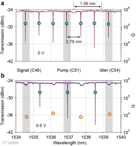 研究团队在绝缘体上氮化硅平台制作了芯片。通过测试微环系统的热调谐光谱,可以看出选择性Q值调控手段的有效性,如图2所示。设计器件的FSR约为100 GHz,匹配密集波分复用信道。在热调电极施加0 V电压时,两环完全失谐,所有高Q谐振峰均来自主环。在施加6.6 V电压后,两环对齐,主环中每间隔2个FSR的谐振峰工作在EP点附近,表现出明显的Q值下降(约20倍),同时不发生模式劈裂。