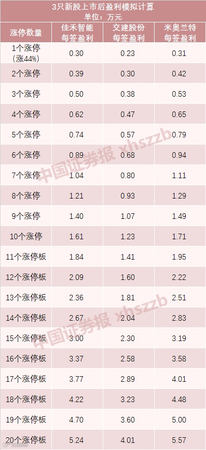 佳禾智能、交建股份、米奥兰特,三只新股上市后若能收获连续7个涨停板,则每签获利分别约为1.04万元、0.8万元、1.11万元。