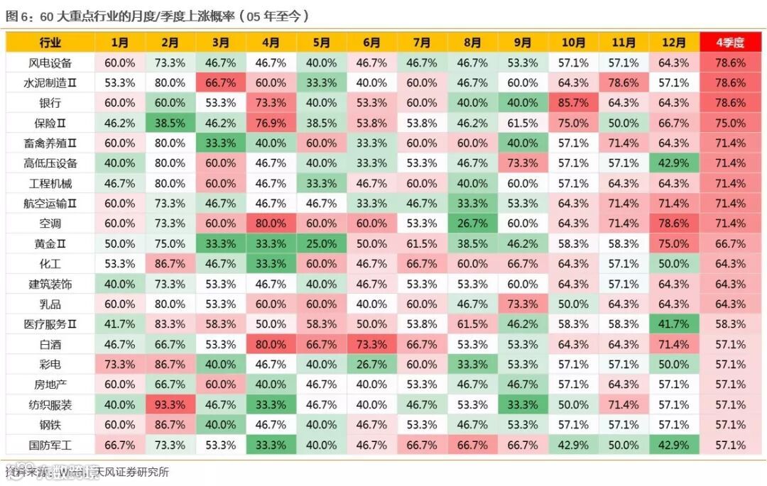 上述投资经理援引数据指出,2009年以来的10年间,除了2013年全年风格偏小、2017年全年风格偏大之外,其余8年A股均在四季度出现了明显的风格切换,启动时点多在10月至11月,持续时长大多在2-3个月。另外从2005年至今的数据来看,四季度上涨概率大的行业是风电设备、水泥制造、银行、保险。