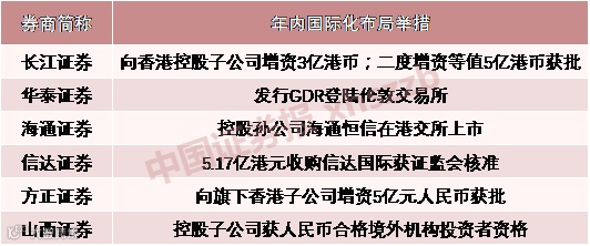 从国际化布局看,除却对境外子公司增资外,收购境外公司股权、发行GDR(全球存托凭证)、拆分子公司境外上市、斩获海外业务资格也成为券商国际化布局的重要举措。