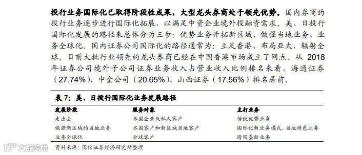 国信证券分析师王剑指出,当前我国投行业务国际化已取得阶段性成果,大型龙头券商处于领先优势。“国内证券公司国际化的路径通常为:立足香港、布局亚太、辐射全球。目前大批行业领先的龙头券商已经在中国香港市场成立了网点,国内证券业领先机构的国际化进程已经从网络布局、业务拓展阶段步入资源整合、转型升级阶段,从跨境业务发展迈向国际业务拓展的深水区。”