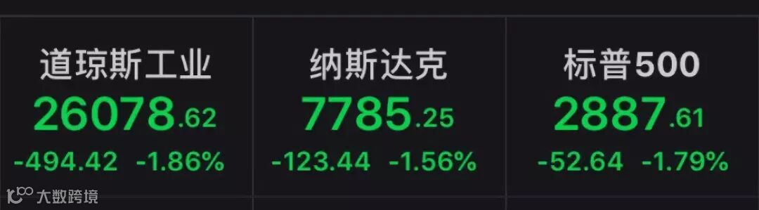 据Wind数据,10月2日,美股三大指数全线低开低走。截至收盘,道琼斯工业指数下跌494.42点,跌幅为1.86%,报26078.62点;标普500指数跌52.64点,跌幅为1.79%,报2887.61点;纳斯达克指数跌123.44点,跌幅为1.56%,报7785.25点。