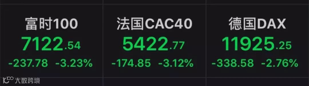 欧洲三大股指全线重挫。德国DAX指数跌2.76%,收报11925.25点;法国CAC40指数跌3.12%,收报5422.77点;英国富时100指数跌3.23%,收报7122.54点。