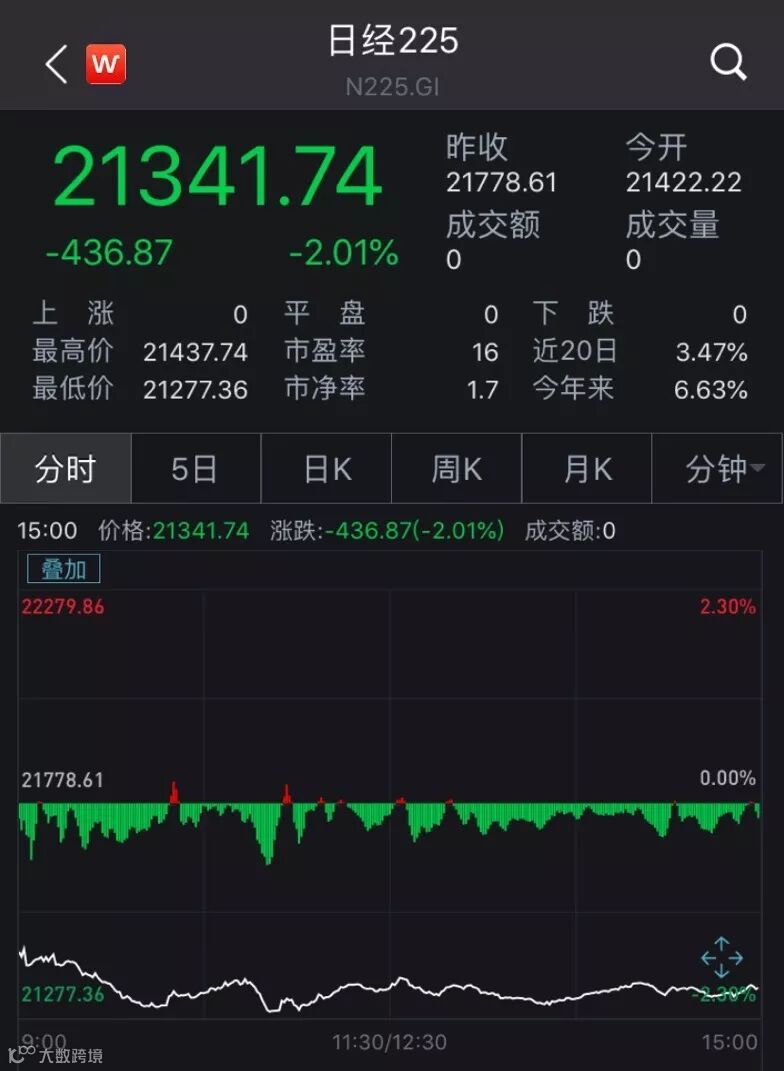 日经225指数大幅低开1.64%,随后继续下行,收盘时下跌436.87点,跌幅达2.01%,报21341.74点,创9月10日以来的逾三周收盘新低。