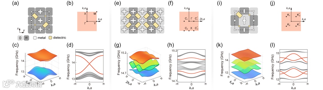 图2|不同的π通量光子晶体。全π、条纹型π、以及棋盘格型π通量光子晶体构型(a, e, i)、布里渊区(b, f, j)、体能带(c, g, k)及投影能带(d, h, l)。