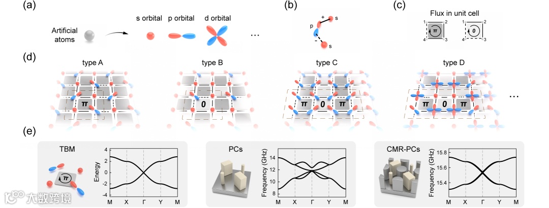 图1|基于人工高阶轨道模式以及轨道取向的合成π通量晶格。(a) 人工原子中的不同阶轨道模式。(b) 基于轨道模式耦合产生的正负耦合。(c) 元胞内负耦合数量决定规范通量的值。(d) 四种基于不同轨道耦合的π通量晶格。(e) A晶格在紧束缚模型、纯介质光子晶体以及受限米共振光子晶体中的能带。